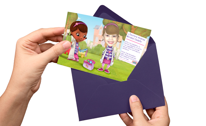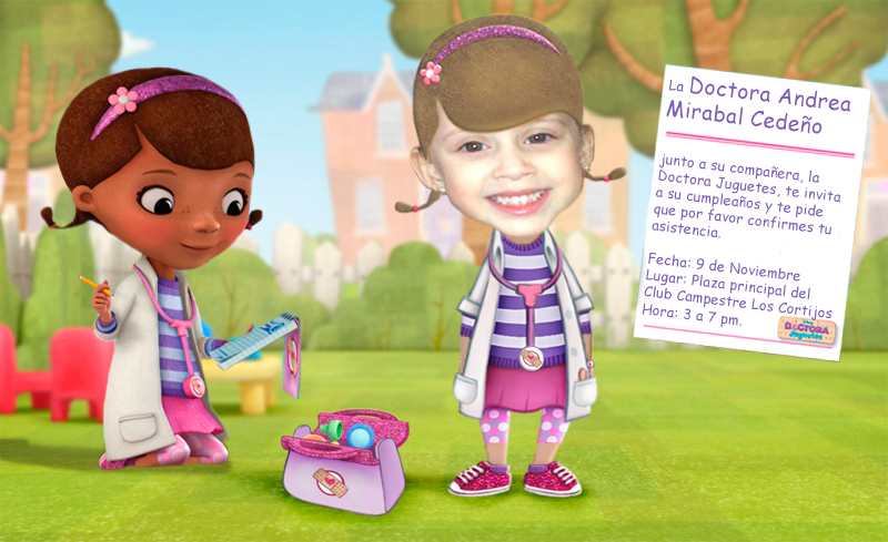 Descripción: Tarjeta de invitación para cumpleaños con temática de la Doctora Juguetes para Andrea de 4 años Año: 2013 Software: Photoshop